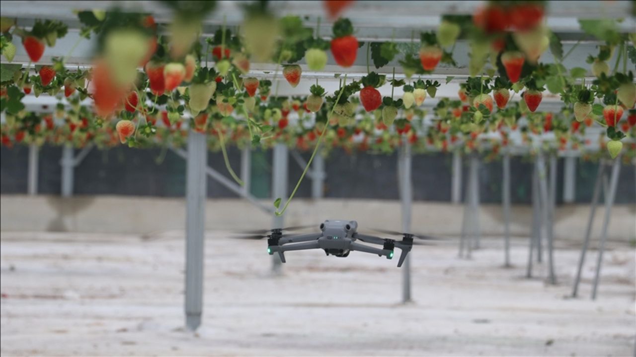 Kurulan topraksız serada, dronlar, yüksek çözünürlüklü kameralar ve sensörler aracılılığıyla sıcaklık, pH değeri ve nem gibi çok sayıda veri analiz edilerek çilek üretimi yapılıyor.