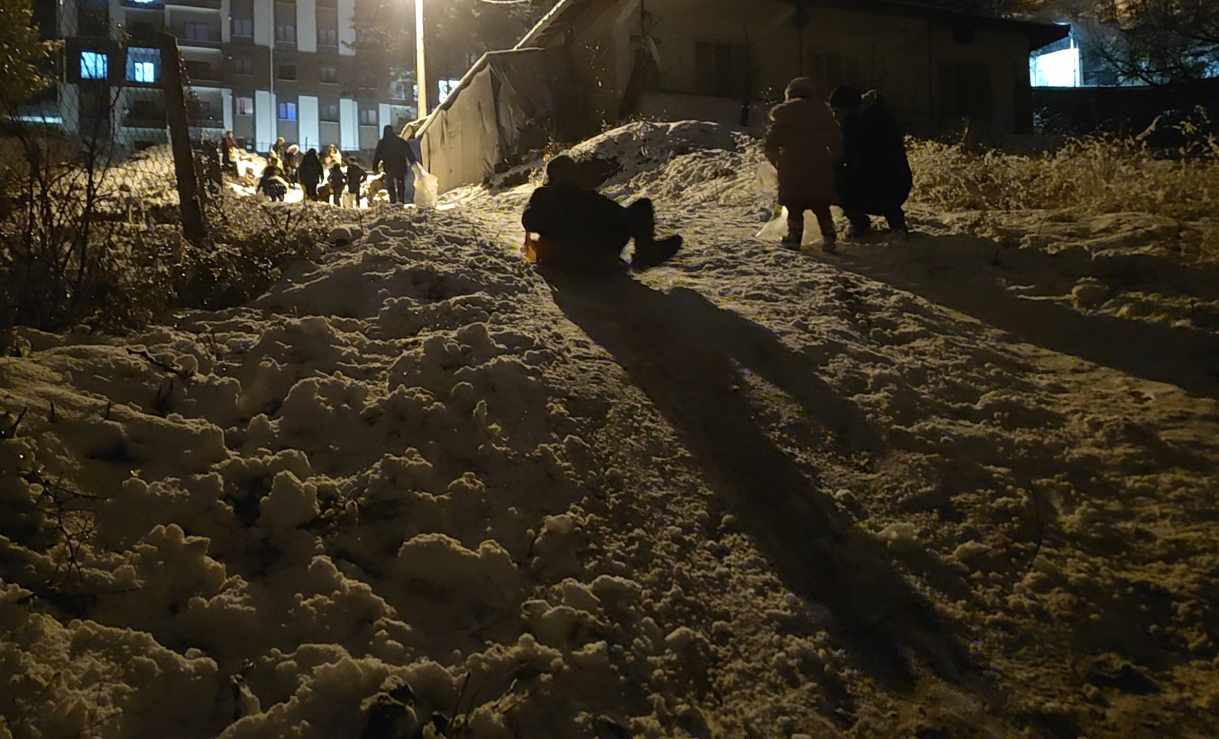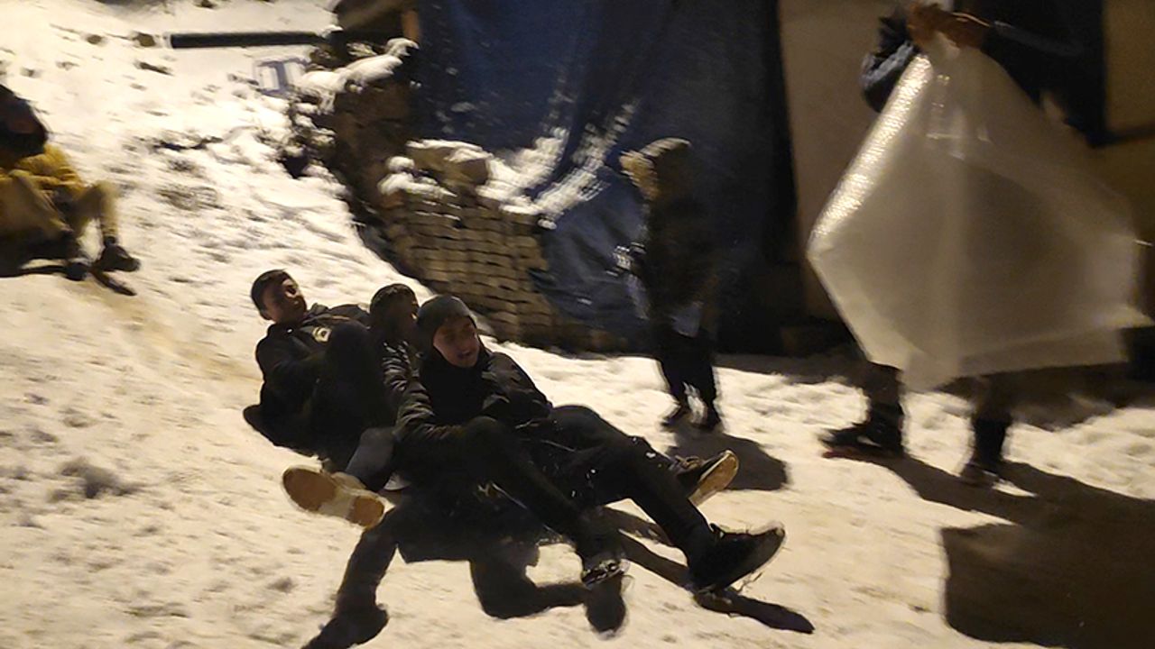 Yılın son akşamında mahalle aralarında bir araya gelen çocuklar, evlerinden getirdikleri çöp poşetleri ve leğenlerle kayarak karın tadını çıkardı.