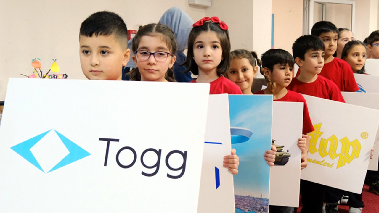 Çorum'da ilkokul öğrencileri, "Tutum, Yatırım ve Türk Malları Haftası" kapsamında düzenlenen etkinlikte, Türkiye'nin yerli otomobili TOGG ile savunma sanayi alanında geliştirilen hava araçlarını tanıttı.